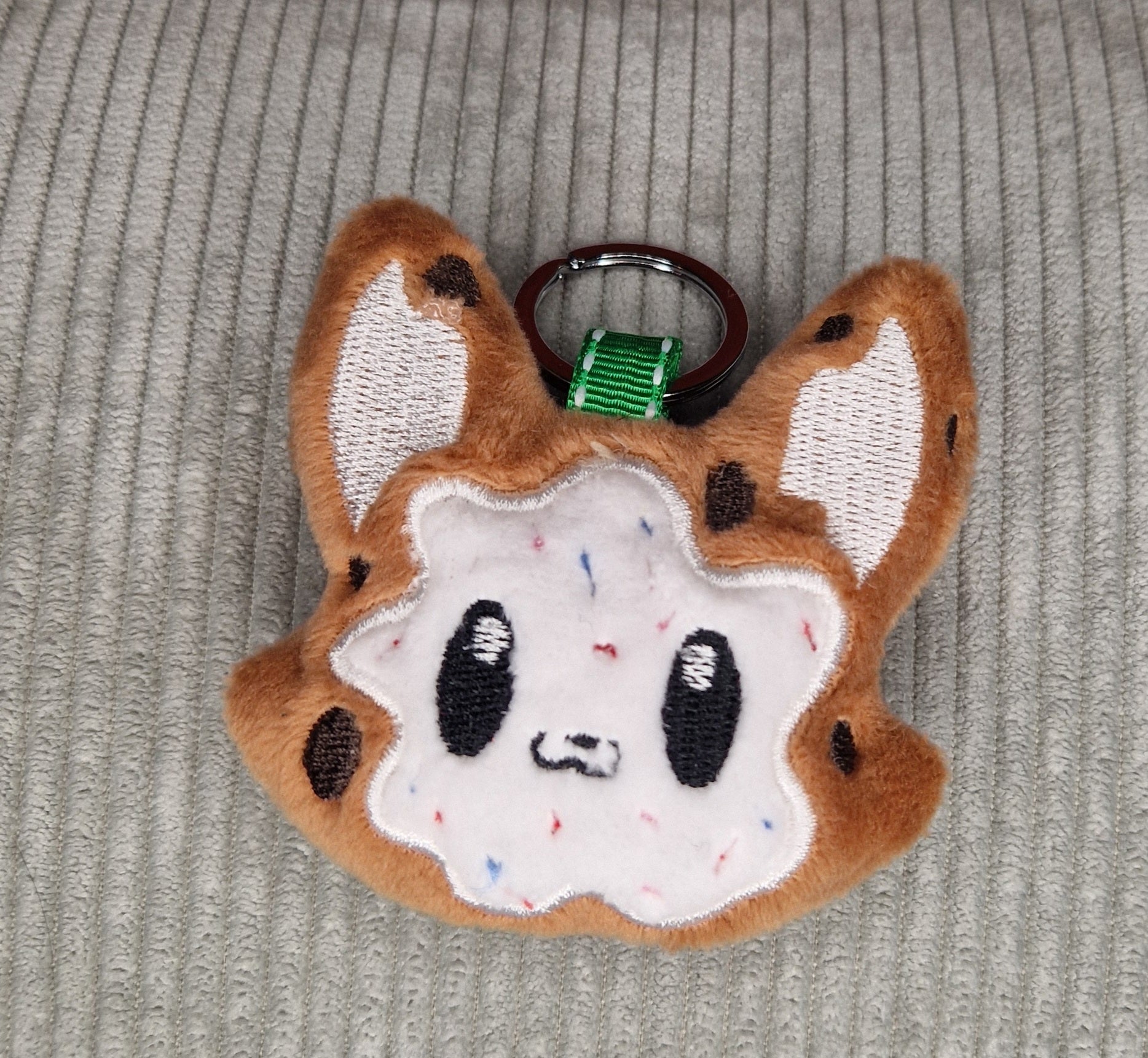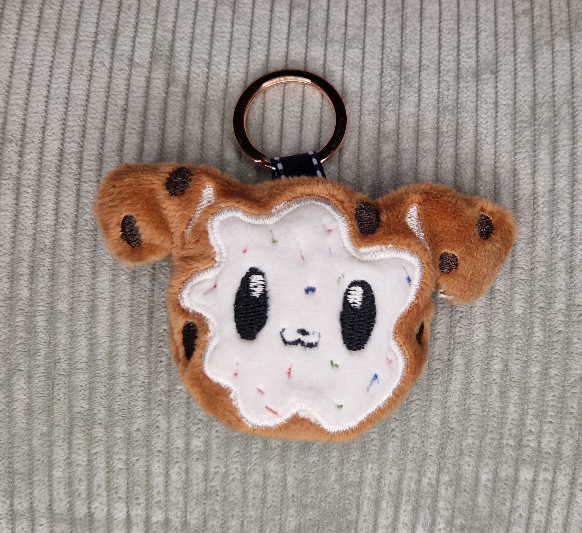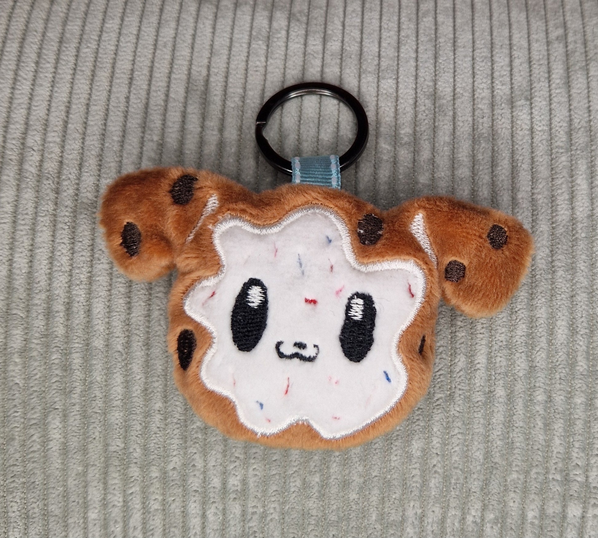 Süßer Schlüsselanhänger in Tierform und Cookieoptik (Vorderseite bestickt) auf kuscheligem Minky Stoff, wartet darauf adoptiert zu werden und für dich da zu sein.