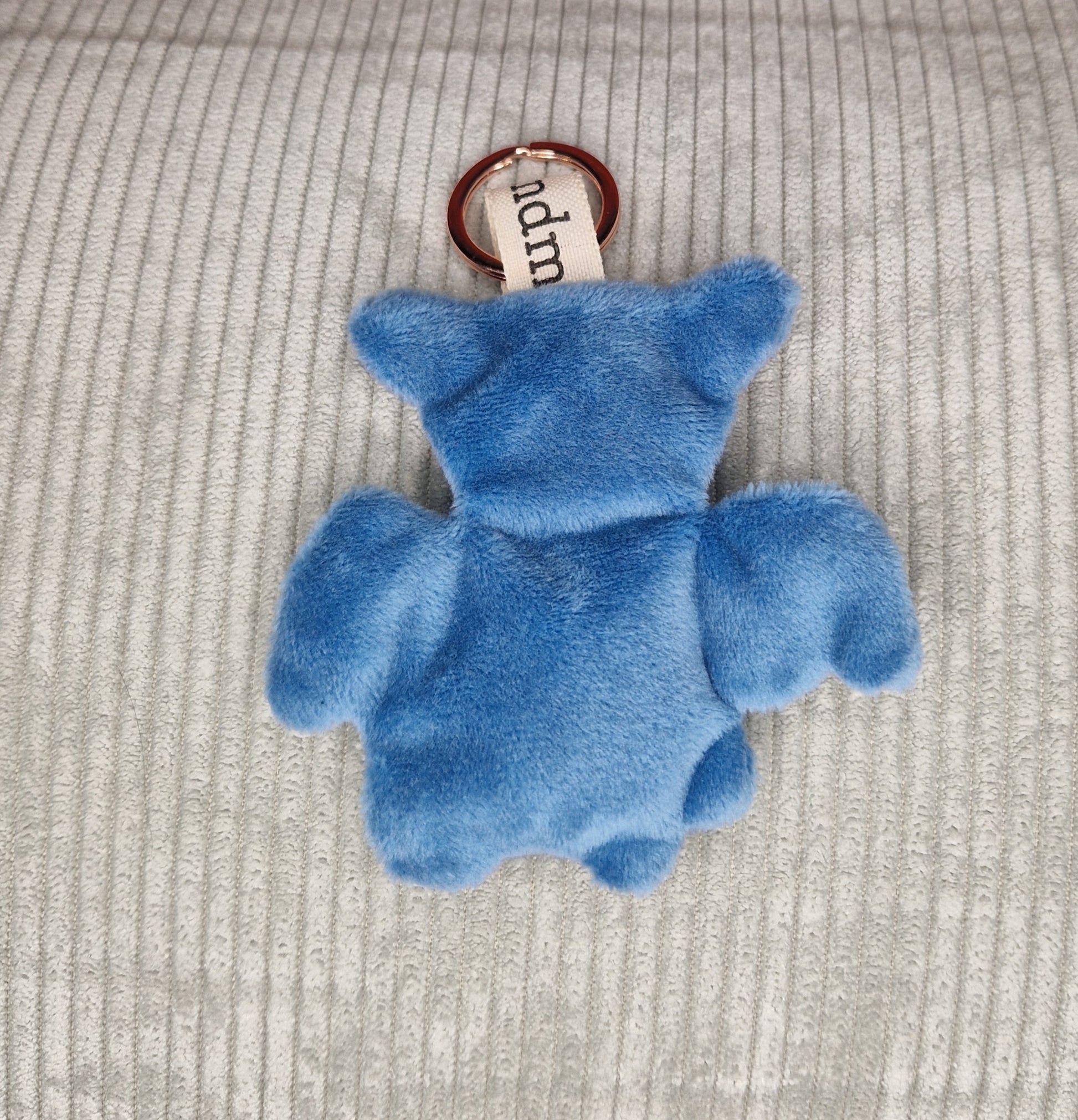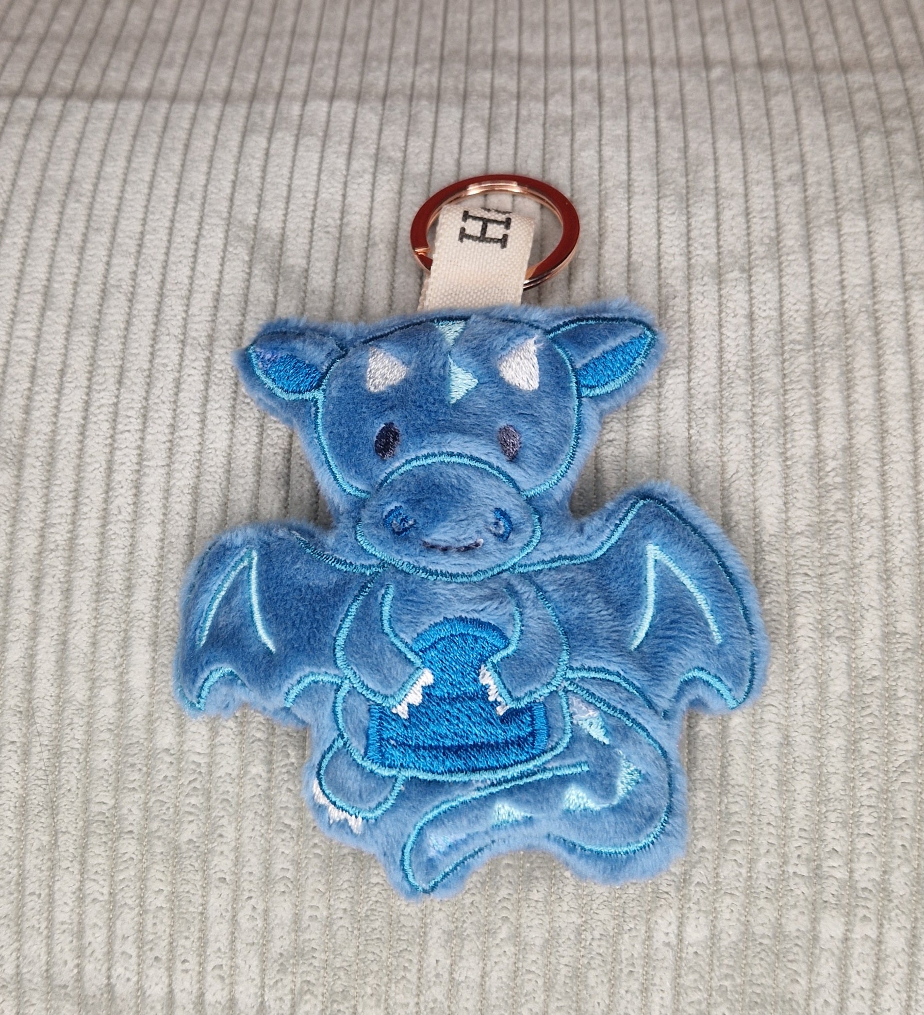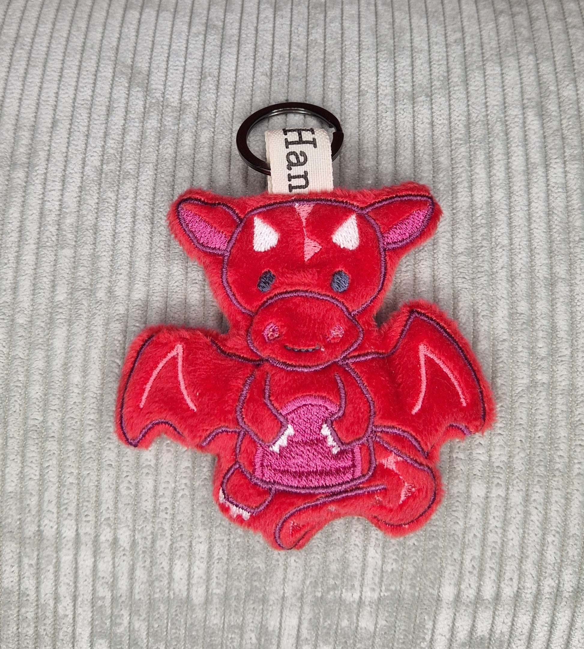 Süßer Schlüsselanhänger in Drachenform (Vorderseite bestickt) auf kuscheligem Minky Stoff, wartet darauf adoptiert zu werden und für dich da zu sein.