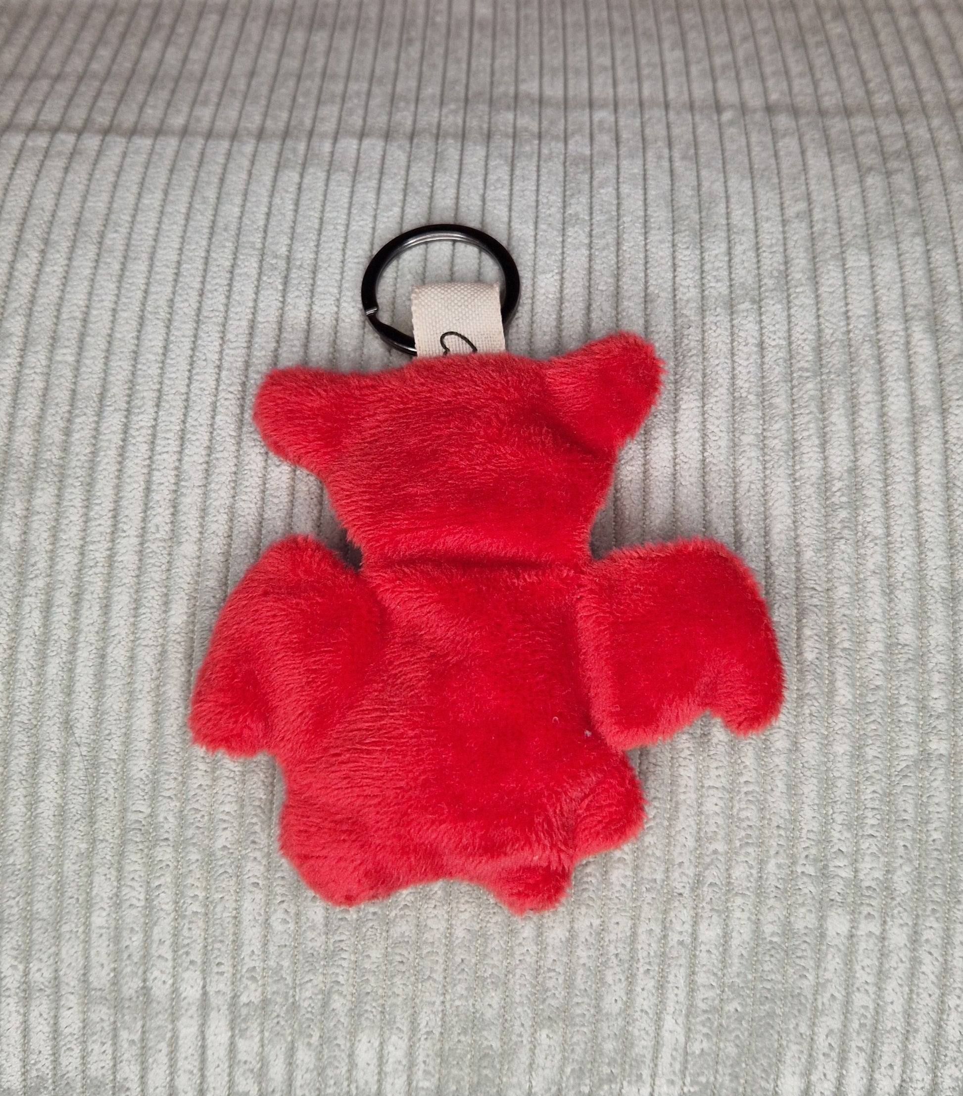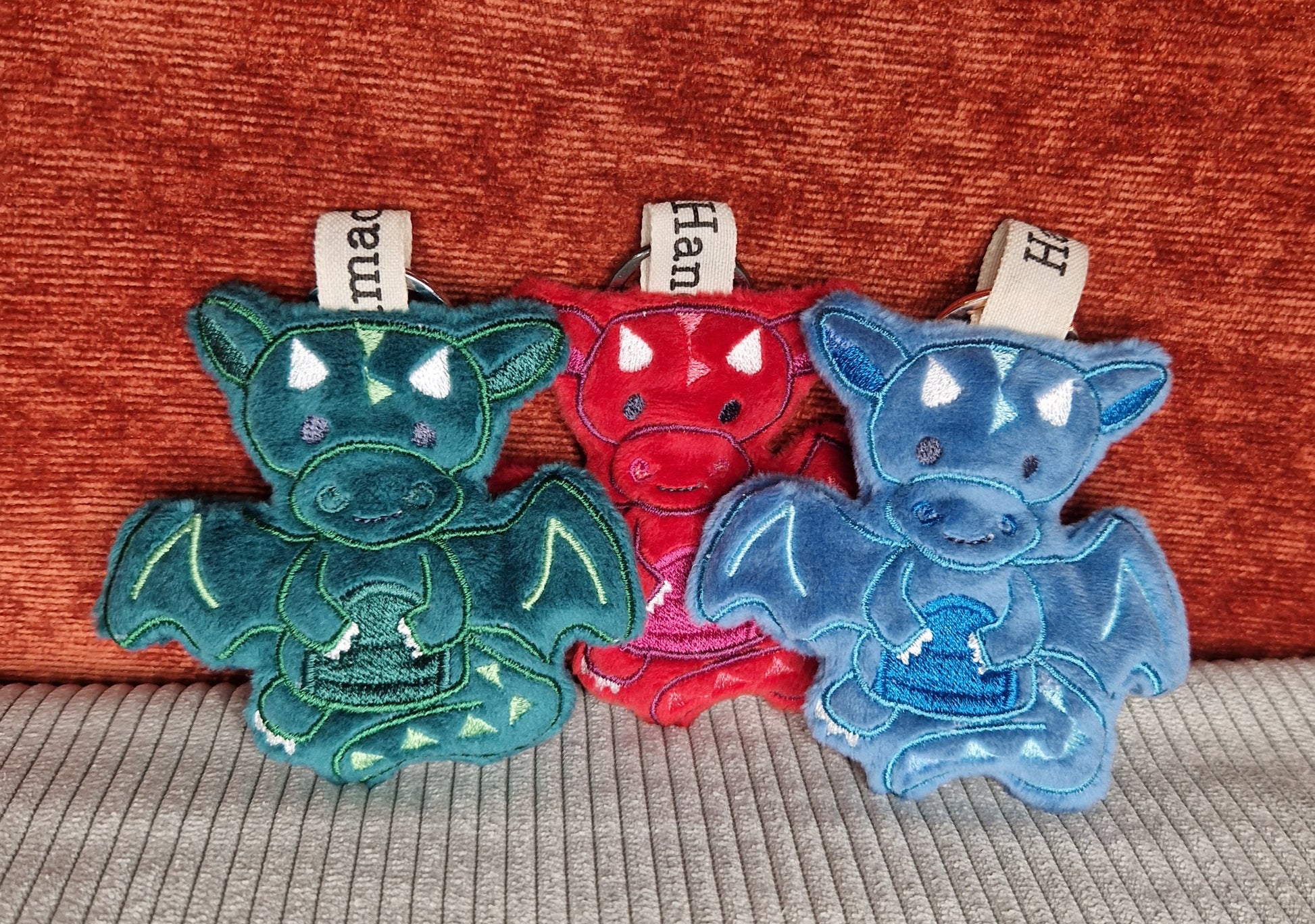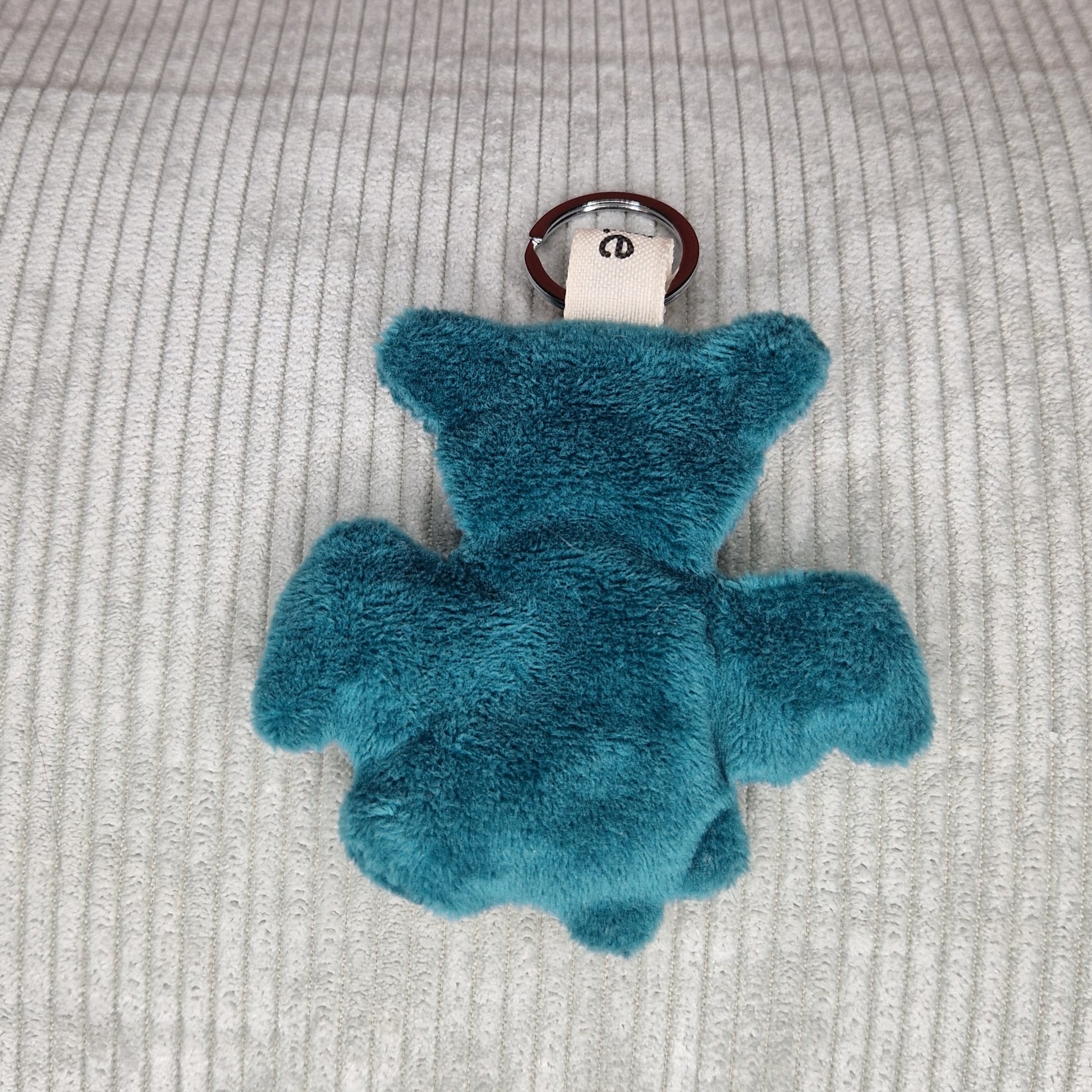 Süßer Schlüsselanhänger in Drachenform (Vorderseite bestickt) auf kuscheligem Minky Stoff, wartet darauf adoptiert zu werden und für dich da zu sein.